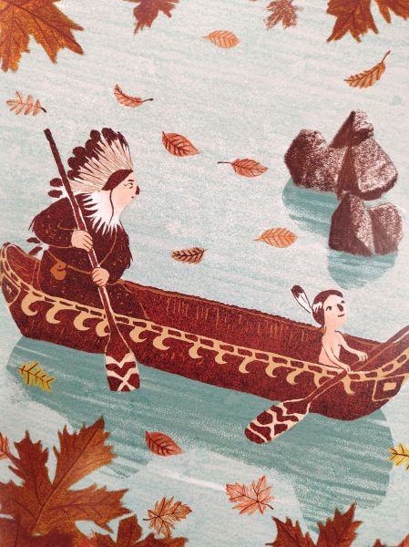 « Grand-Aigle et Petit-Castor sont assis au bord des rives transuilles du lac Massawipi, sous le ciel piqueté d’étoiles d’une nuit de pleine lune. Le vieux sage raconte à son petit-fils la naissance du peuple amérindien, un jour de grande paix, aux premières lueurs du tout premier matin. » Résumé du livre.