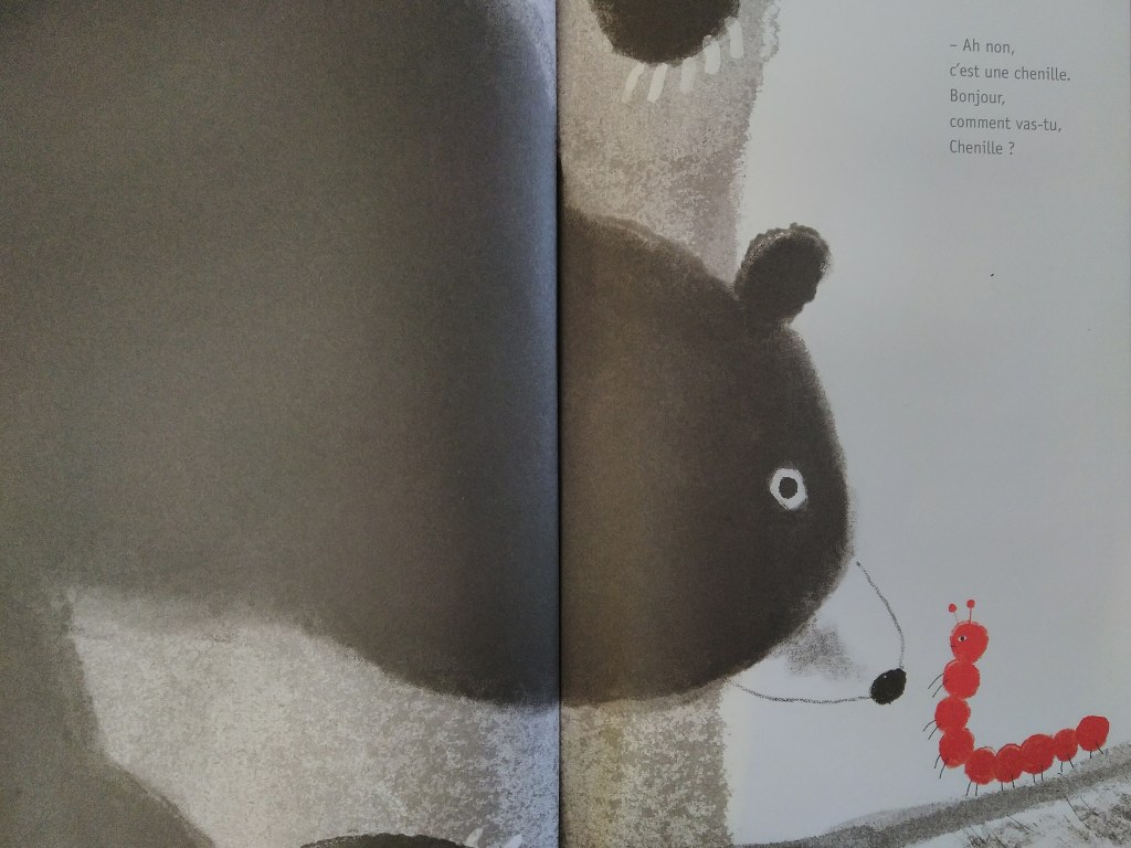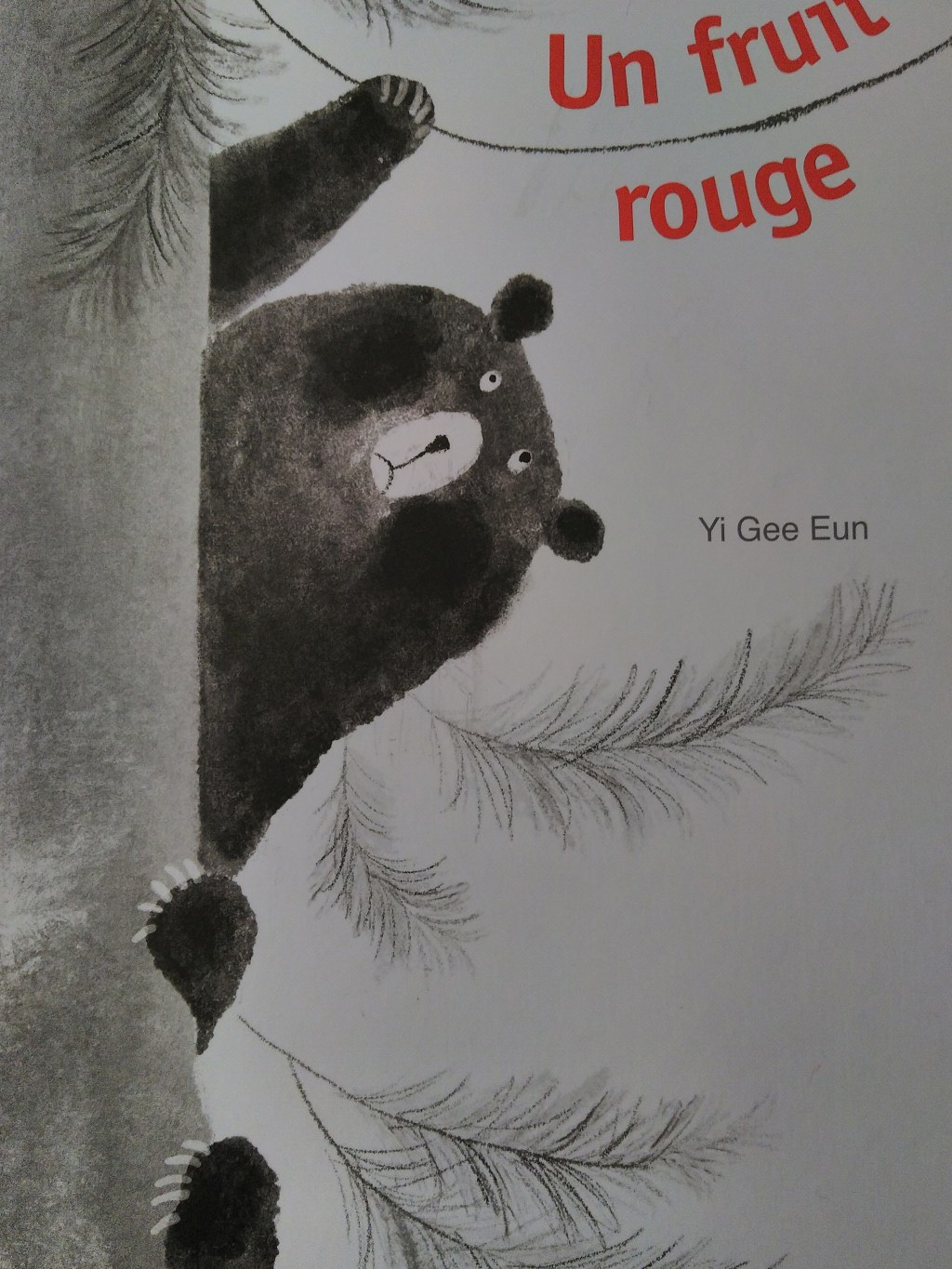 Mon avis : c’est un album magnifique. Le trait est doux et tendre. Le contraste marqué entre le blanc et noir donne une sensation de simplicité. Il allège la lecture de l’image et la rend à la porté des plus jeunes. Quelques nuances de rouge matérialisent la quête du fruit rouge, et viennent apporter une touche de couleur plus chaude.