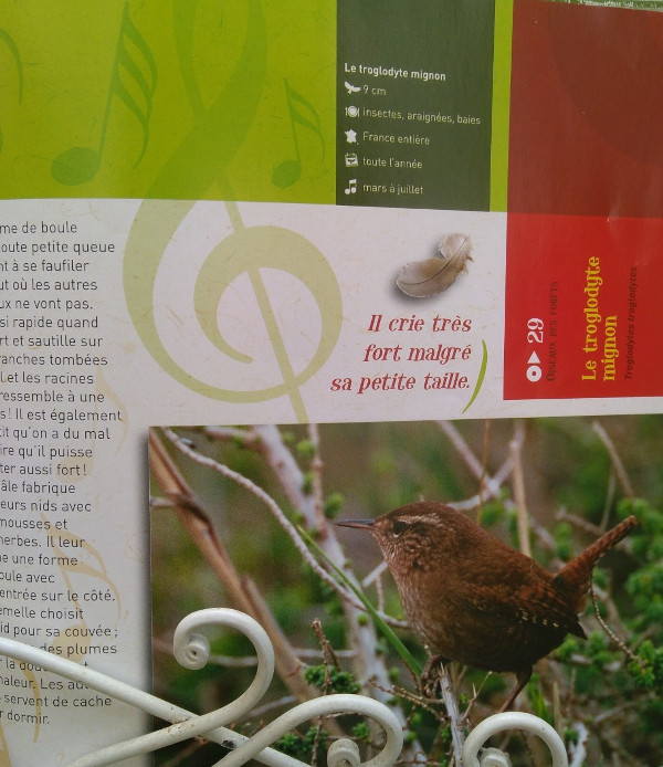 Je vous propose une dernière image du livre. Un petit oiseau très difficile à voir. Le troglodyte mignon. J’ai longtemps vécu à la campagne, mais je ne l’ai vu qu’une ou deux fois dans ma vie à la faveur de la chance. C’est un oiseau minuscule, alors ouvrez l’œil. 😉