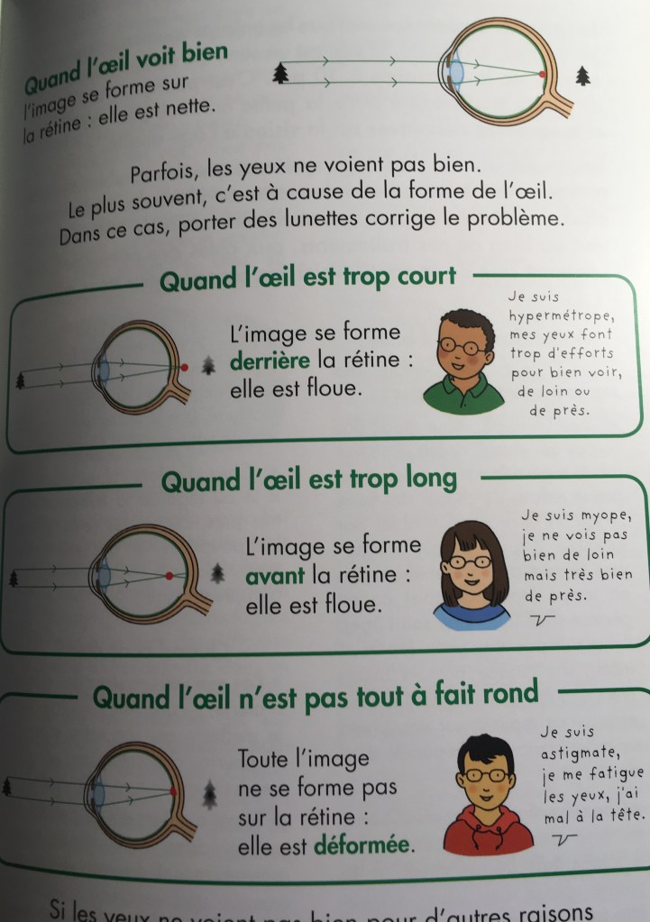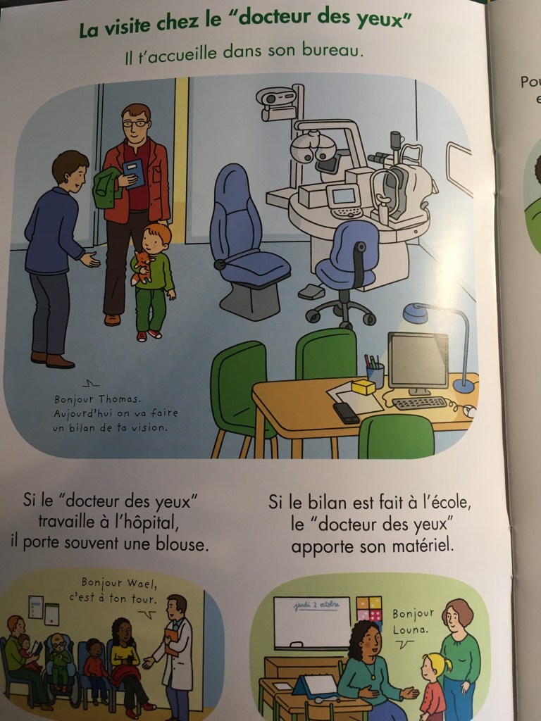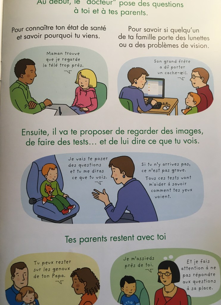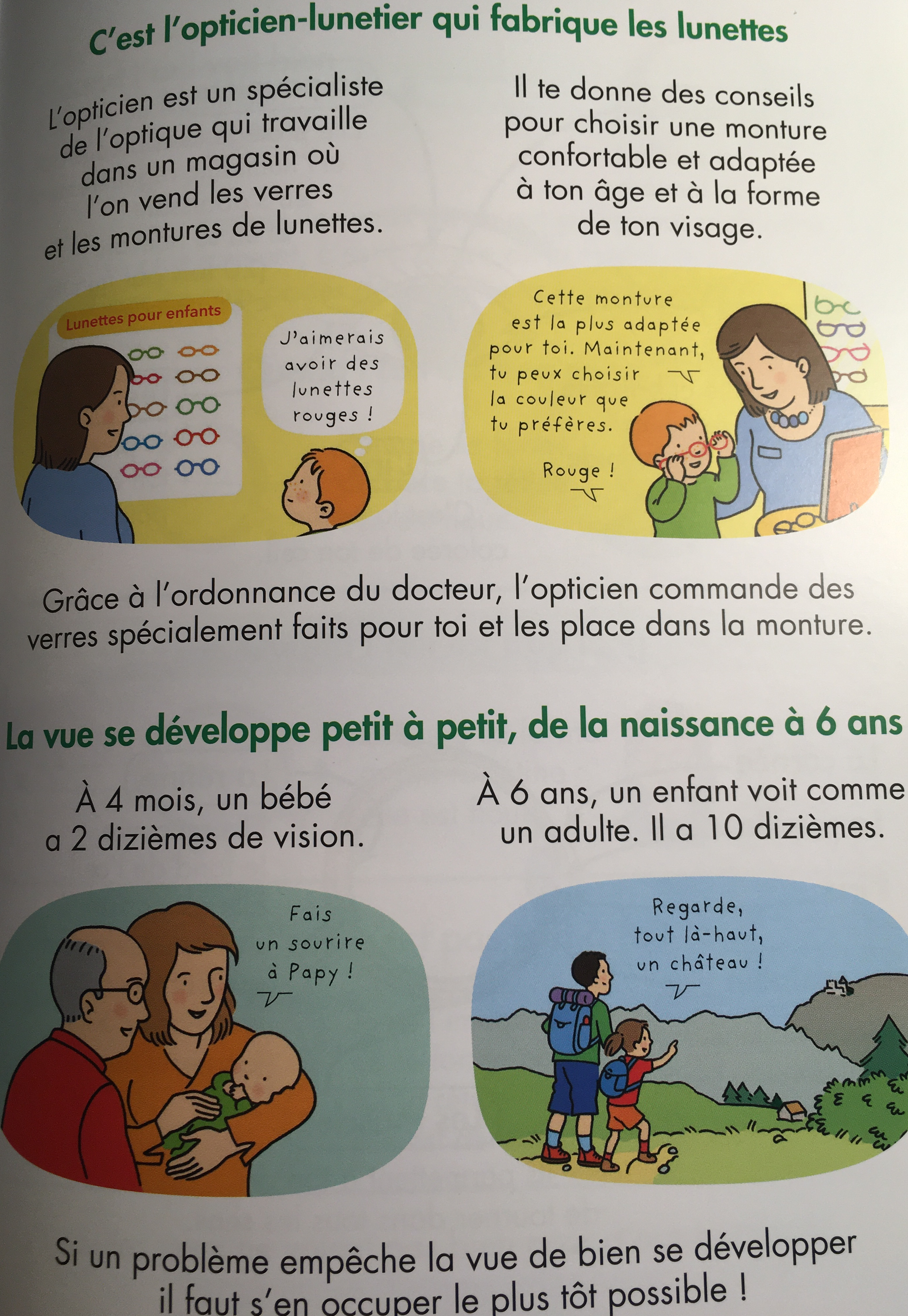 C’est un guide pratique et bien construit. On peut trouver une partie pour les enfants, sous forme de documentaire B.D., qui présente le cabinet de l’ophtalmologiste, le matériel qu’il utilise, le déroulement de la séance…