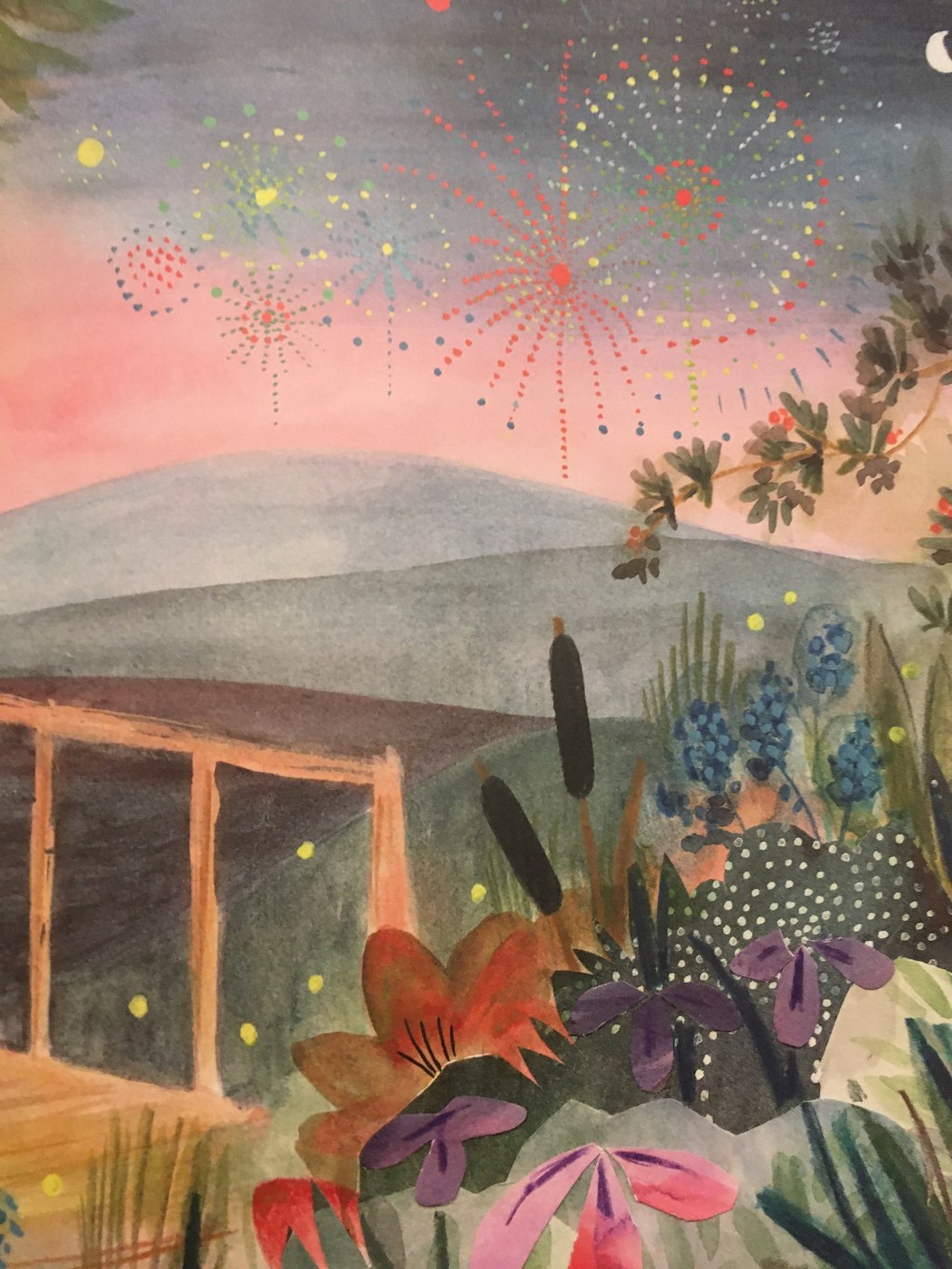 J’ai choisi de vous présenter cet album, car il touche plusieurs sujets rarement abordés dans la littérature jeunesse. On parle de la curiosité scientifique. Nous avons là une grand-mère qui pour faire son art utilise les sciences. Elle dessine ses feux d’artifices avant d’écrire sur les côtés des formules mathématiques complexes, qui lui permettront d’arriver à les réaliser.