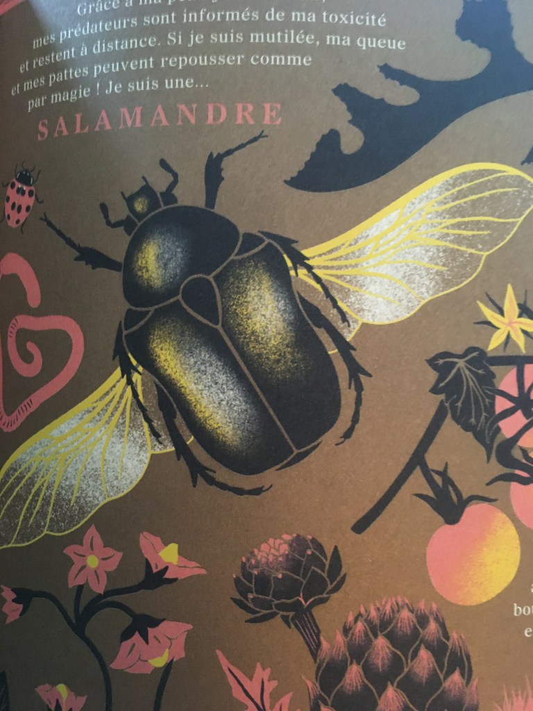 Ce qui est intéressant dans ce concept, c’est que l’enfant visualise les animaux, les insectes et les plantes. Il va utiliser ce livre des tonnes de fois. Il va le lire et le relire. S’amuser à trouver de plus en plus vite. Donc, il apprend sans s’en rendre compte. Et un jour, au cours d’une balade, il reconnaîtra une fleur, un oiseau ou un insecte, qu’il avait découvert dans ce livre.