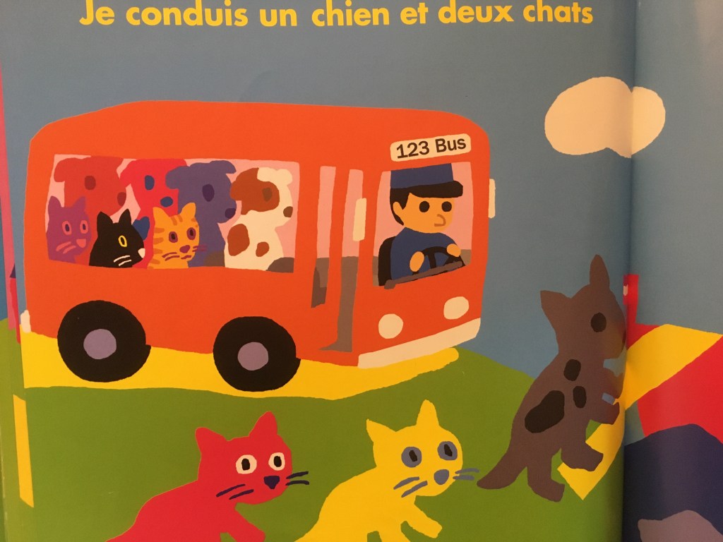 Un second niveau de lecture permet d’appréhender quelques notions de calculs. Les animaux montent et descendent en groupe du bus. On peut jouer avec l’enfant à compter seulement les chats ou juste les chiens. On peut faire une addition simple ou une soustraction. On peut compter les animaux dans le bus. L’enfant peut se familiariser avec les chiffres de façon ludique.