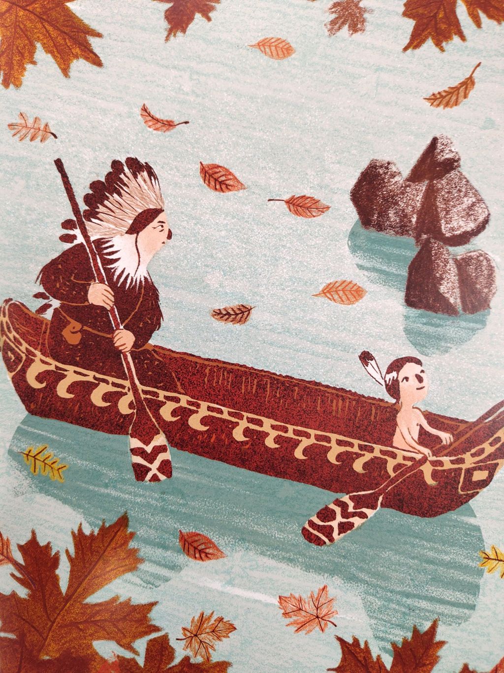 Les illustrations sont exceptionnelles, le dessinateur utilise un camaïeu de marron, beige et rouge pour faire ressentir l’automne. On peut se transporter dans le canoë et voguer sur les rapides avec eux. Les nuances de bleu profondes viennent associer l’eau à ce périple.